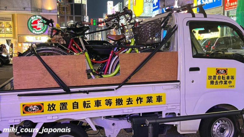 Le terme « vélo en stationnement illicite » (Hōchi-jiten-sha) n'est pas défini par la durée du stationnement ou par son but, mais par l’état dans lequel se trouve le vélo. Même pour une course de courte durée, si vous laissez votre vélo sur place et vous en éloignez, de sorte qu’il ne puisse pas être déplacé immédiatement, cela est considéré comme un stationnement illicite. Ces vélos non seulement gênent le passage des piétons, mais risquent également d'entraver la circulation des véhicules d'urgence. En cas d'enlèvement, vous devrez payer des frais de garde lors de la restitution ; veillez donc à toujours utiliser les parkings à vélos.